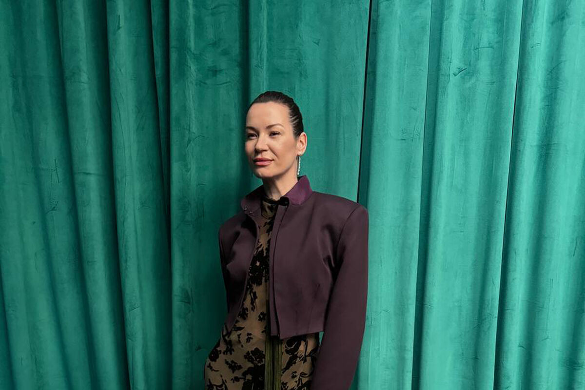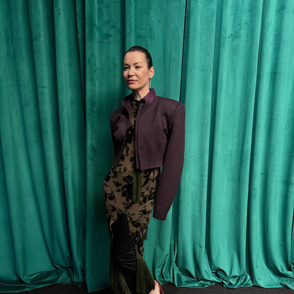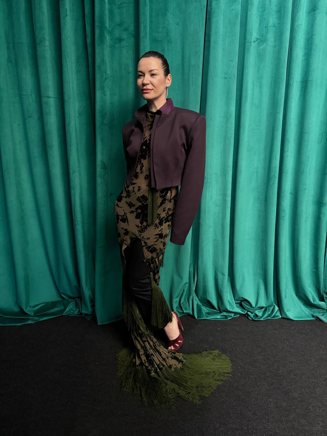 Ида Галич позировала в полупрозрачном пестром платье с длинным шлейфом с зелеными перьями. Образ дополнил коричневый жакет и красные босоножки. Волосы ей собрали в низкий пучок и сделали вечерний макияж.
