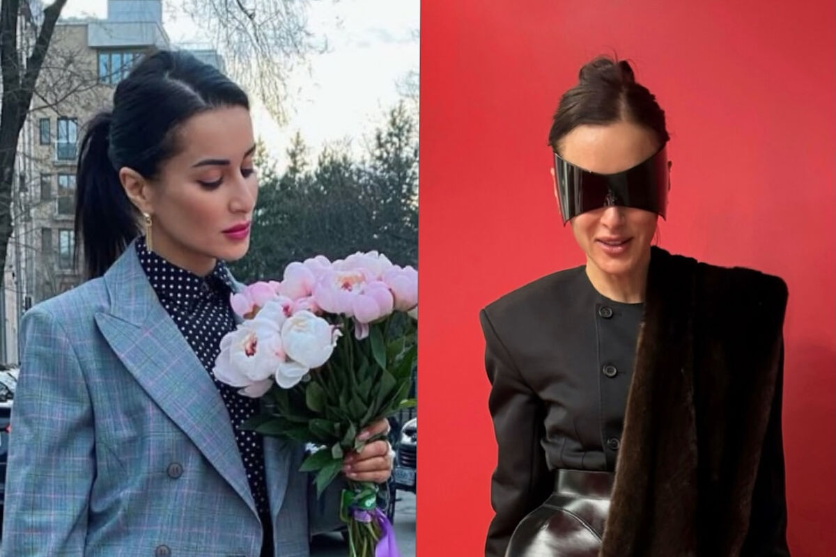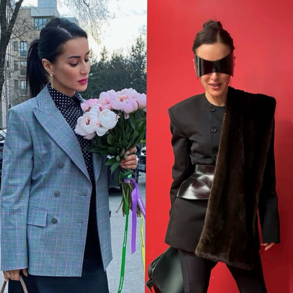 Тина Канделаки показала фото, на котором позировала в юбке-карандаш и жакете. Образ дополнили розовые туфли на высоких каблуках и бежевая сумка. На современном фото она позировала в облегающих брюках, жакете и шарфом из меха. Образ завершали очки и туфли с острым мысом.