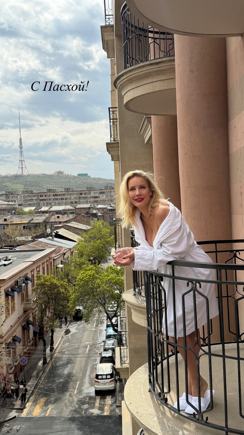 47-летняя Елена Летучая позировала перед камерой в белом халате и тапках на балконе с видом на Ереван. Телеведущая была запечатлена с распущенными волосами и макияжем с черной тушью и красной помадой. Она поздравила поклонников с Пасхой.