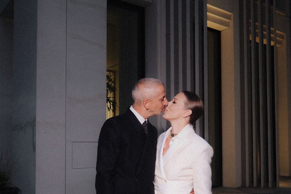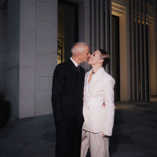 Ксения Собчак позировала перед камерой в белом костюме с широкими брюками, черными сандалиями и золотым чокером. Журналистке уложили волосы в гладкий пучок и сделали макияж. Константин Богомолов был запечатлен в белой рубашке с галстуком и черном брючном костюме и туфлях. На одном из фото супруги целовались.
