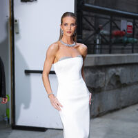 Рози Хантингтон-Уайтли пришла на ужин в белом облегающем платье-футляре и отделкой из страз. Образ дополнили украшения с бриллиантами от ювелирного бренда. Волосы ей уложили в низкий пучок и сделали вечерний макияж со стрелками.