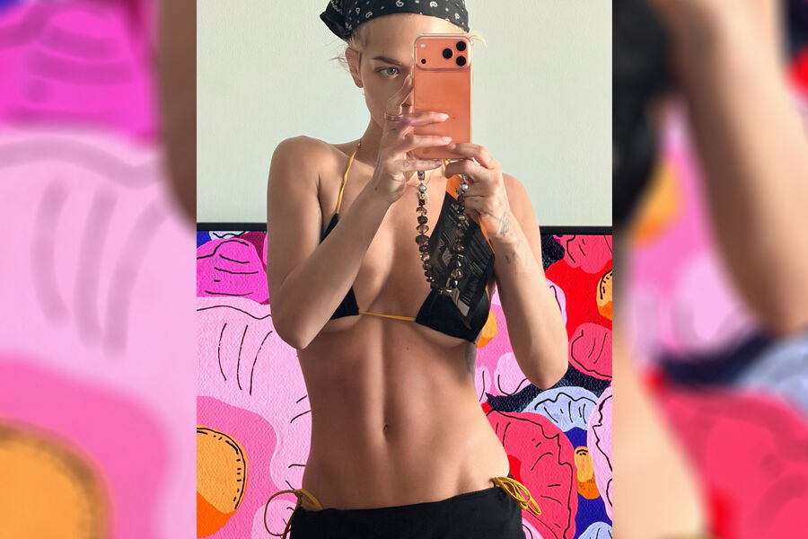 35-летняя Рита Ора стояла перед зеркалом в крошечном черном лифе бикини, который дополнила юбкой в тон, банданой с принтом и золотым кольцом. Певица позировала с убранными волосами и без косметики.