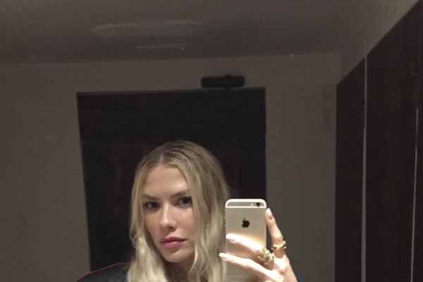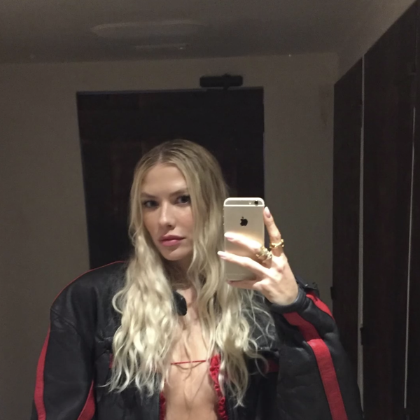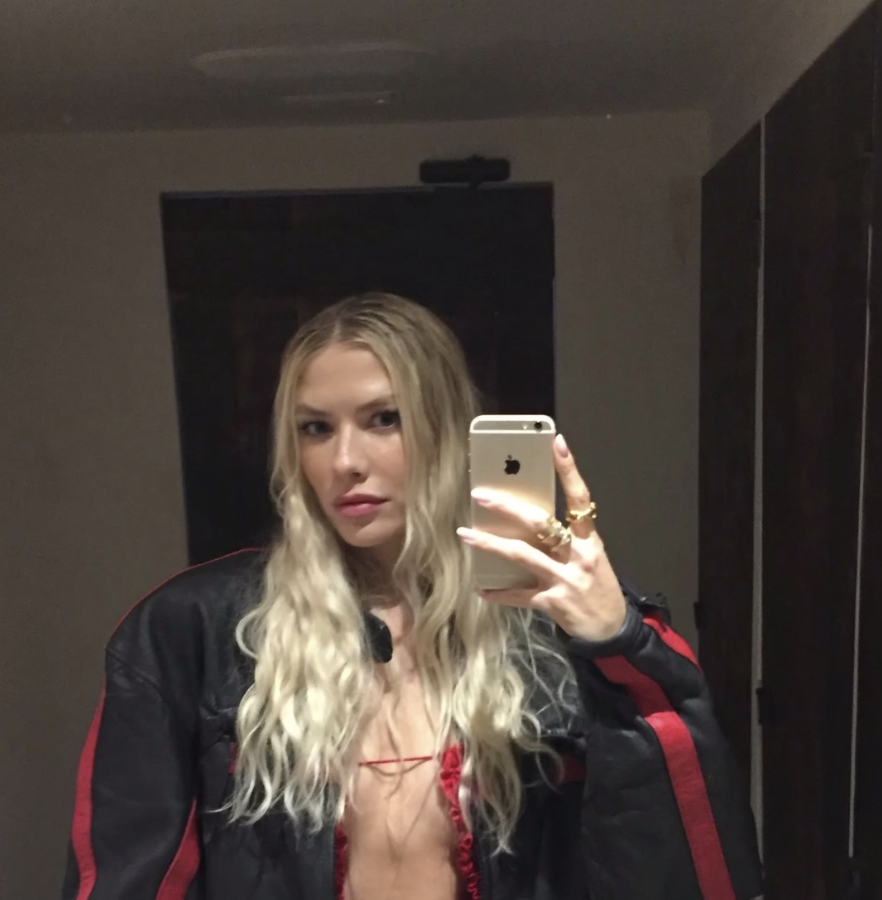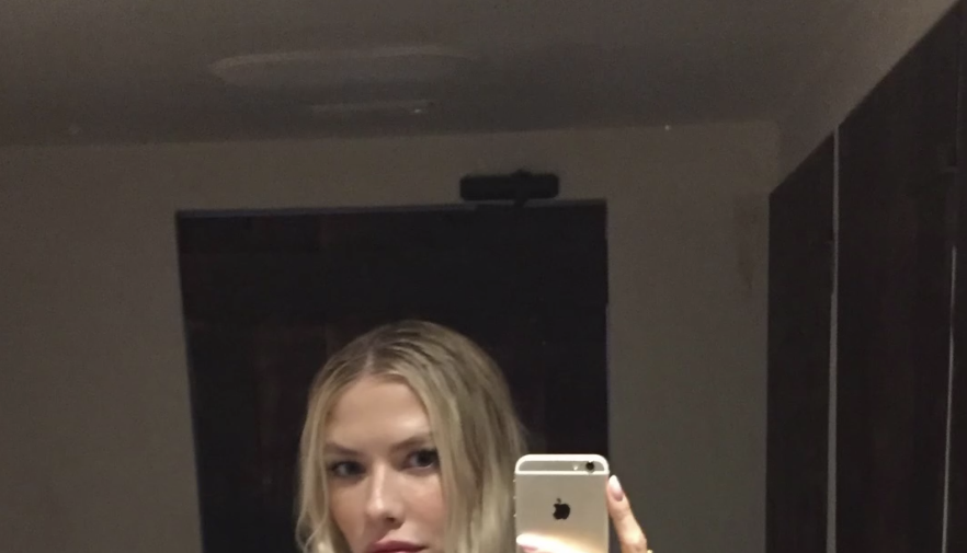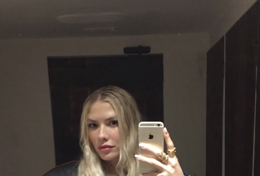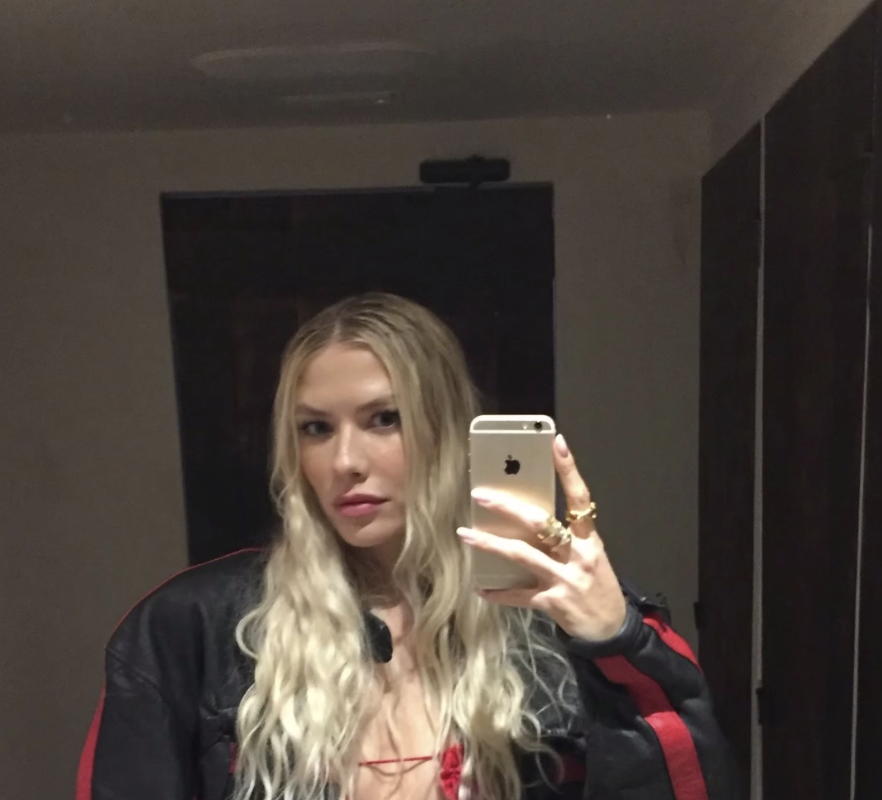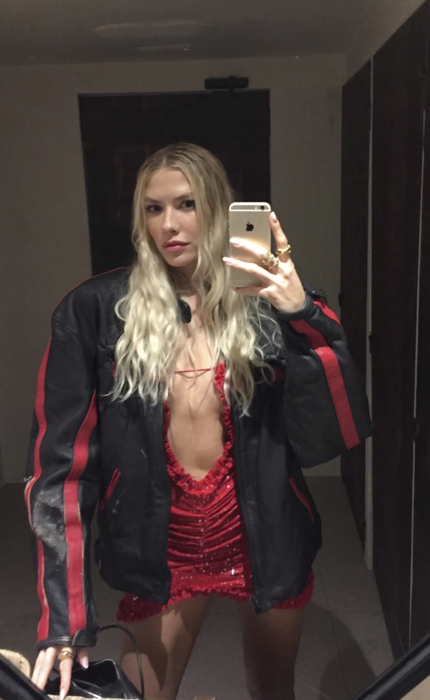 Елена Перминова стояла перед зеркалом в красном мини-платье с вырезом на груди, под которое не стала надевать бюстгальтер. Модель добавила к наряду черную кожаную куртку с полосами и золотые кольца. Манекенщица позировала с распущенными волосами и макияжем в естественном стиле.