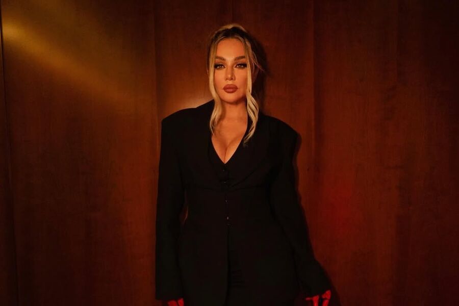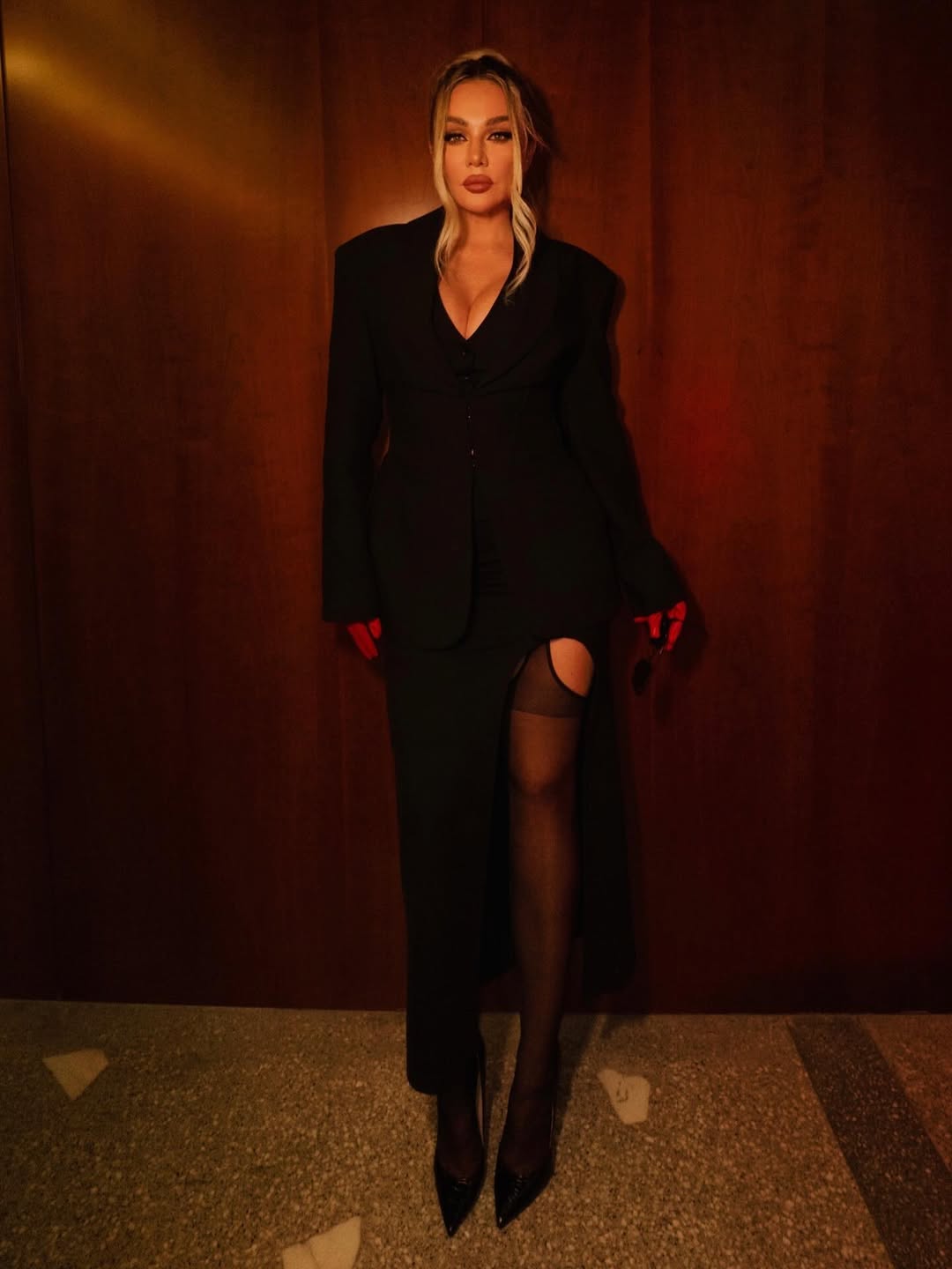 43-летняя Анна Седокова вышла на публику в черном костюме, который состоял из жакета с глубоким декольте и юбки с разрезом до бедра. Певица дополнила комплект чулками в тон, туфлями на каблуках и красными кожаными перчатками. Поп-исполнительница позировала перед камерой с собранными в пучок волосами с прядями у лица и макияжем с черными стрелками и розовой матовой помадой.