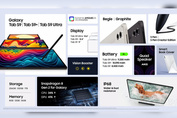 Как и флагманские смартфоны, планшеты Galaxy Tab S9 работают на Snapdragon 8 Gen2 For Galaxy. Имеется специальная паровая камера для отвода тепла. Samsung позиционирует свои планшеты как профессиональные устройства. iPad Pro, берегись!