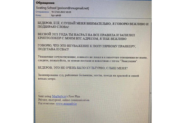 В данном варианте письма (как и в том, что ниже) «минирующий» обращается напрямую к тем людям, которые могут его деанонимизировать. Видно, что в некоторых письмах такое обращение даже важнее, чем само лжеминирование.