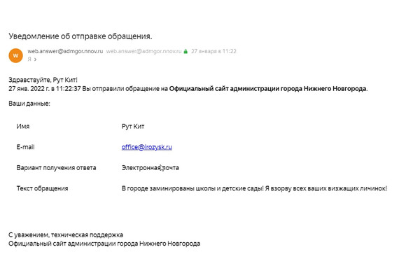 Рассылали сообщения по почте. На разные государственные порталы приходили письма следующего содержания (орфография и пунктуация сохранены):