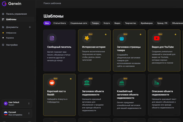 Gerwin — отличный помощник для маркетологов, создателей контента, представителей бизнеса. Позволяет мгновенно генерировать продающие посты для соцсетей, карточки товаров для маркетплейсов, описания для видео, комментарии к статьям, викторины, пресс-релизы и много других полезных видов текста.