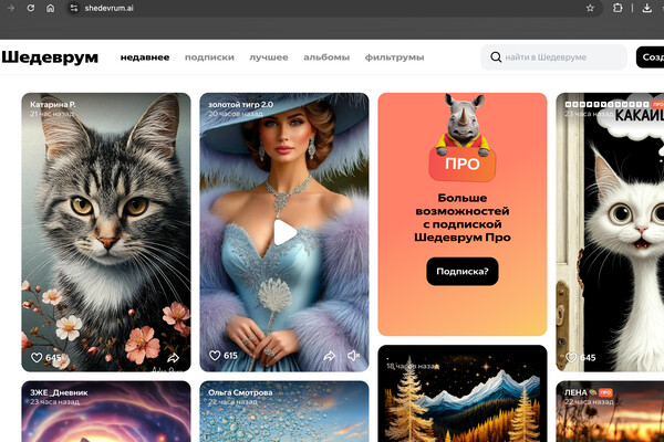 Видео, созданные нейросетью Шедеврум, напоминают небольшие анимации или слайд-шоу. Это скорее творческая песочница и соцсеть: каждая работа появляется в общей ленте, где ее могут увидеть другие пользователи. Видео должно быть опубликовано, иначе вы не сможете сохранить его себе на устройство. Но приватность тут не главная цель — наоборот, можно черпать вдохновение, глядя на чужие генерации, и повторять понравившиеся идеи.