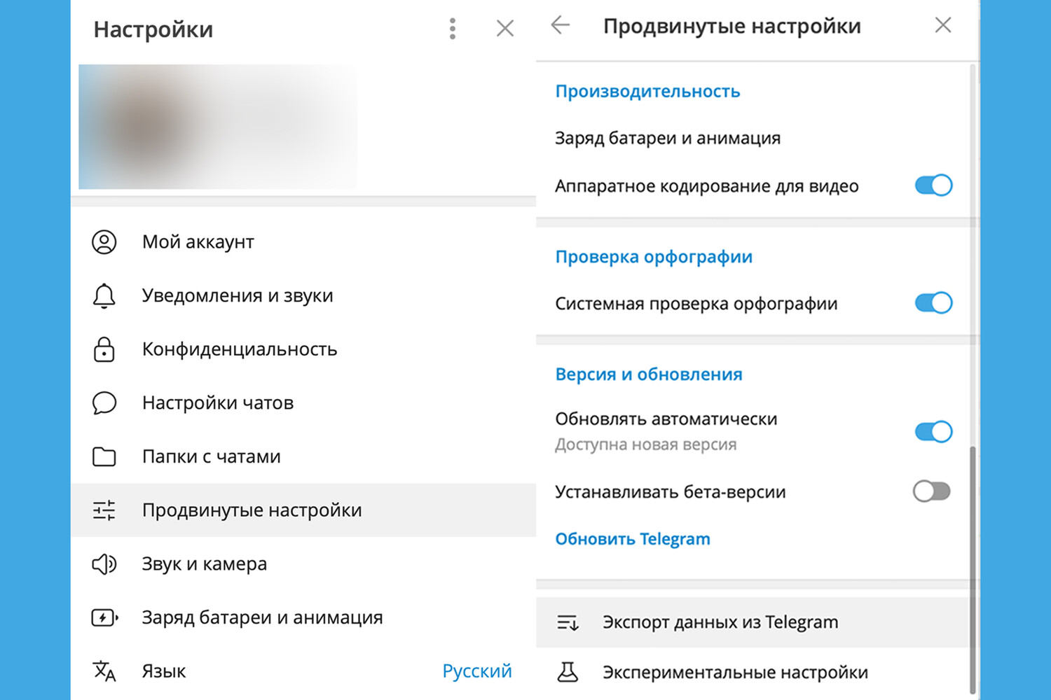 Шаг 2. Зайдите в «Настройки» → «Продвинутые настройки» → пролистайте вниз и выберете «Экспорт данных из Telegram».