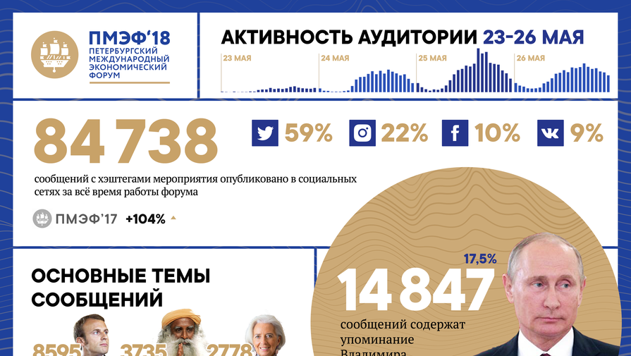 Всего в социальных сетях зафиксировано более 84 тысяч сообщений, посвященных ПМЭФ. Это на 104% выше, чем в прошлом году. Отмечается, что статистика собрана по постам, помеченным хэштегами мероприятия #SPIEF2018 и #ПМЭФ2018 в режиме реального времени.
