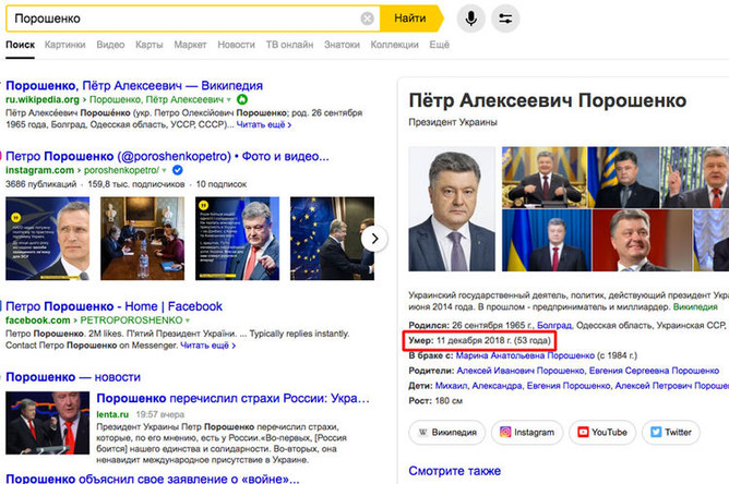 В информации, которую видят пользователи поисковика сообщается, что Порошенко умер 11 декабря 2018 года.
