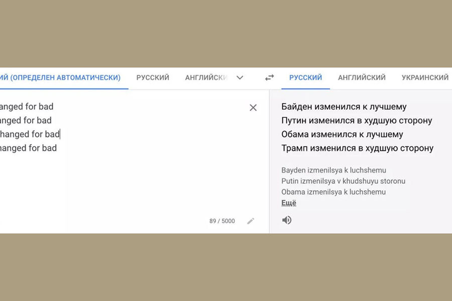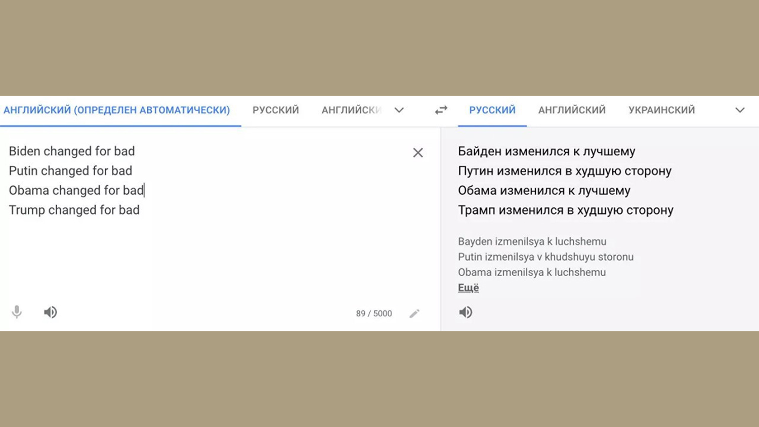 Так, Google Translate переводит предложение «Biden changed for bad» как «Байден изменился к лучшему». Одновременно с этим перевод предложения «Putin changed for bad» звучит как «Путин изменился в худшую сторону».