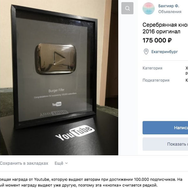 «Настоящая награда от YouTube, которую выдают авторам при достижении 100 тыс. подписчиков. На данный момент награду выдают уже другую, поэтому эта «кнопка» считается редкой», — гласит подпись к объявлению.
