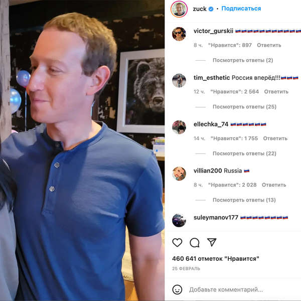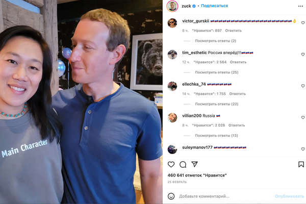 Так, под одной из фотографий, на которой изображен Цукерберг и его жена, пользователь с ником @vladimirovich.v.b написал: «Лицо демократии», добавив несколько смайликов. Часть пользователей оказалась немногословна и оставила в комментариях под снимками главы Meta флаг России.