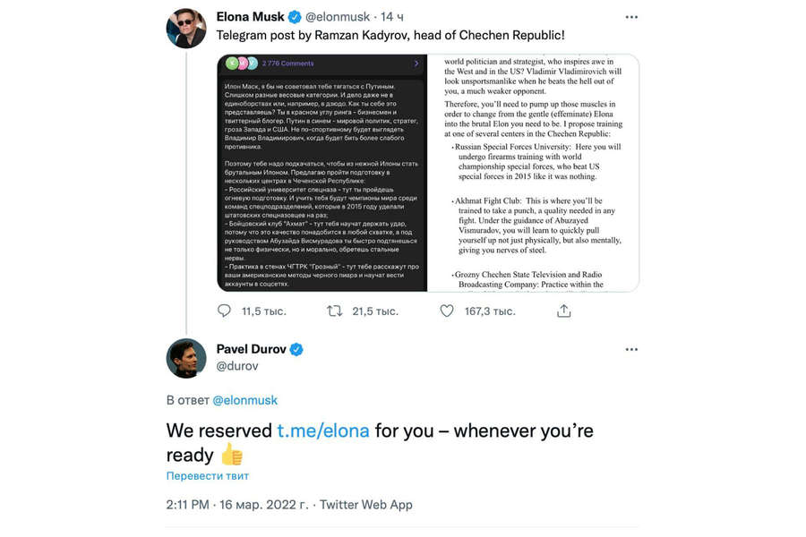 На данный момент обмен ироничными сообщениями двух героев интернета закончился тем, что Кадыров поблагодарил Маска за то, что он отказался блокировать российские информационные ресурсы в сети Starlink на территории Украины.