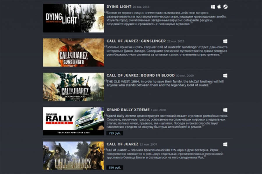 Независимая польская студия Techland сняла с продаж в российском Steam игры серии Dying Light, Call of Juarez, Crime Cities и Xpand Rally Xtreme, а также созданные студиями-партнерами Pure Farming 2018 и God's Trigger. Об этом пишет портал 3DNews.
