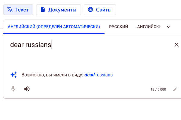 Так, если написать в сервисе фразу «dear Russians», программа предложит заменить слово «dear» (дорогой) на «dead» (мертвый).