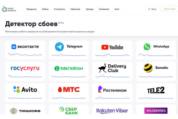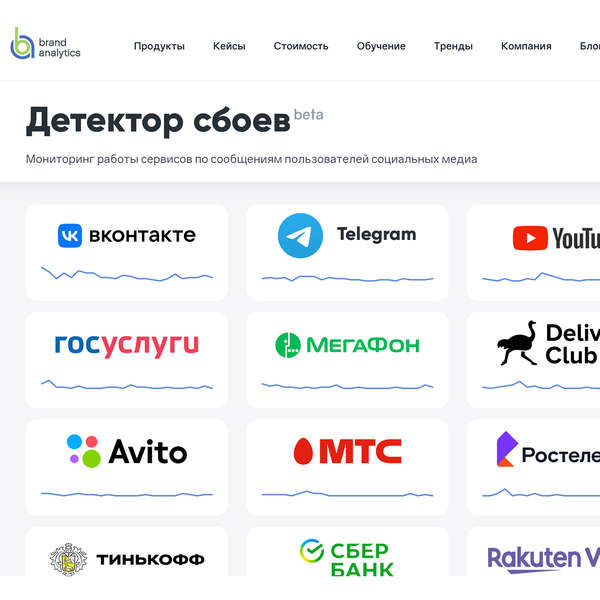 «В связи с этим Brand Analytics, резидент Фонда «Сколково», в мобилизационном режиме подготовил и запустил российский сервис «Детектор сбоев», который уже на старте показывает картину работоспособности по более чем 100 популярным сервисам», — говорится в пресс-релизе компании.