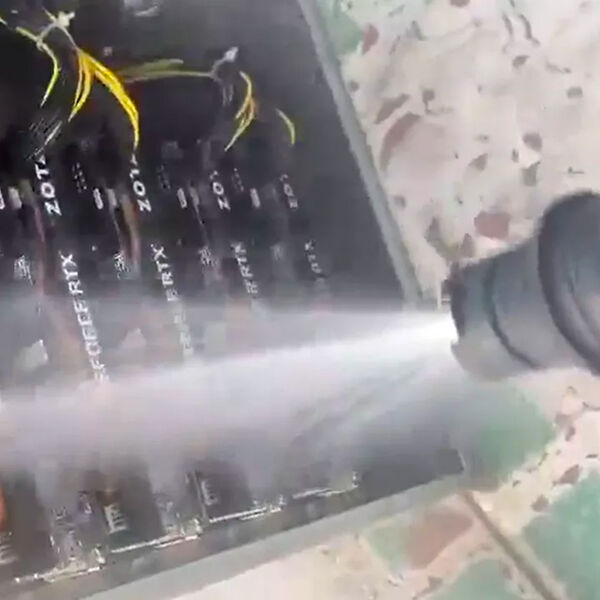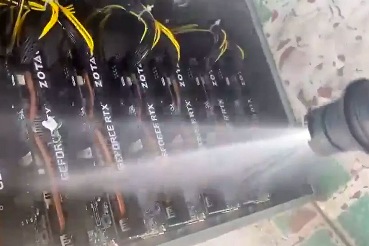 Один из майнеров попал на видео. В ролике он из шланга моет несколько стоек с видеокартами. Утверждается, что эти компоненты пойдут на вторичный рынок.