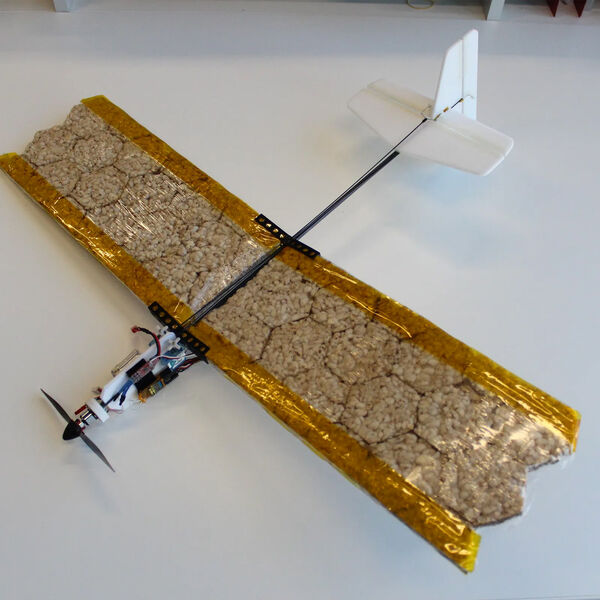 Этот БПЛА получил съедобные крылья — они выполнены из рисовой муки и напоминают печенье. Крылья состоят из ячеек, напоминающих пчелиные соты, которые были склеены при помощи желатина. Они упакованы в пленку, чтобы предотвратить их порчу в процессе полета.