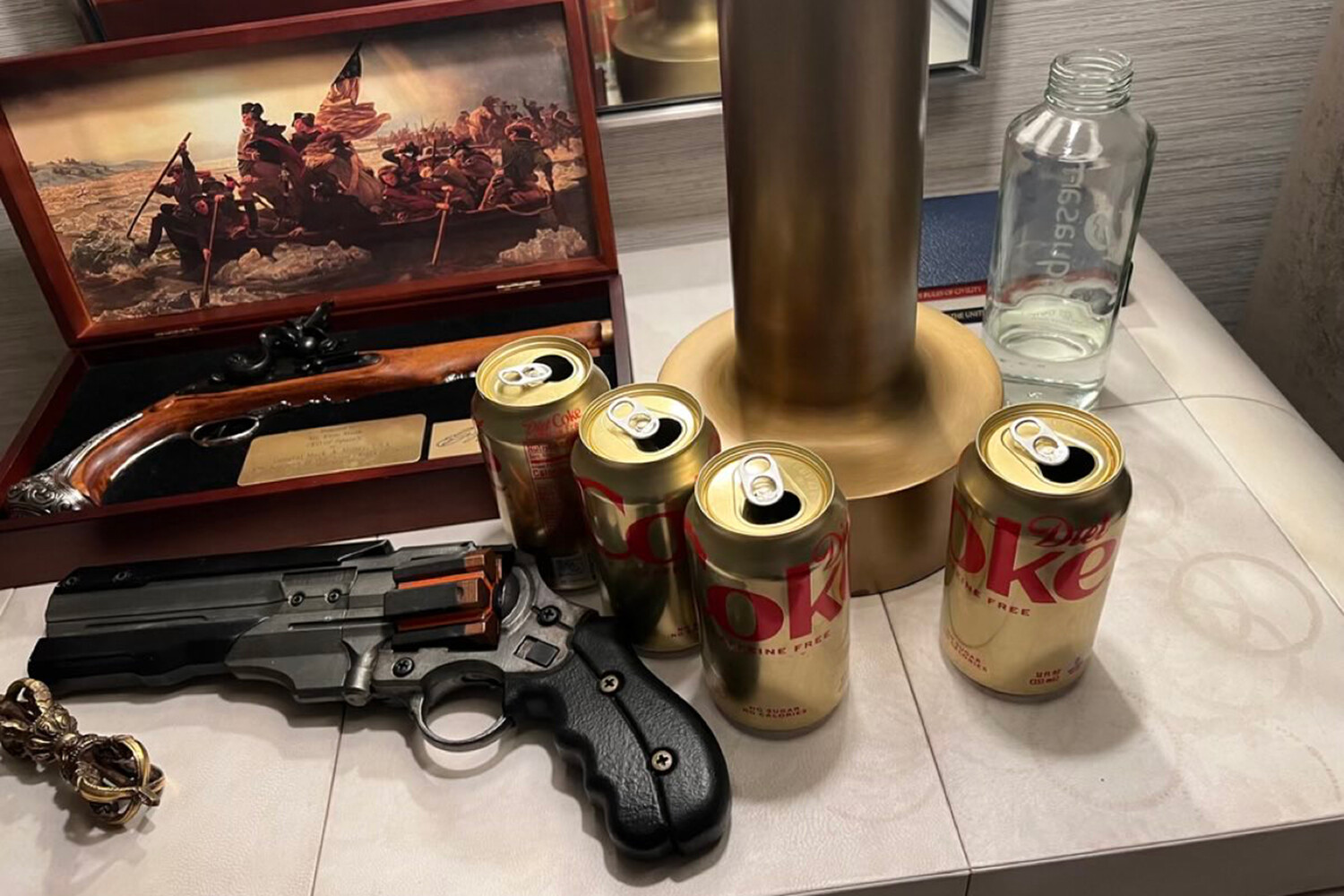 На снимке миллиардера с прикроватным столиком можно насчитать два пистолета, четыре пустых банки из-под диетической колы без кофеина и репродукцию картины Эмануэля Лойце на которой Вашингтон пересекает реку Делавэр. Один из пистолетов спрятан в специальный кейс.