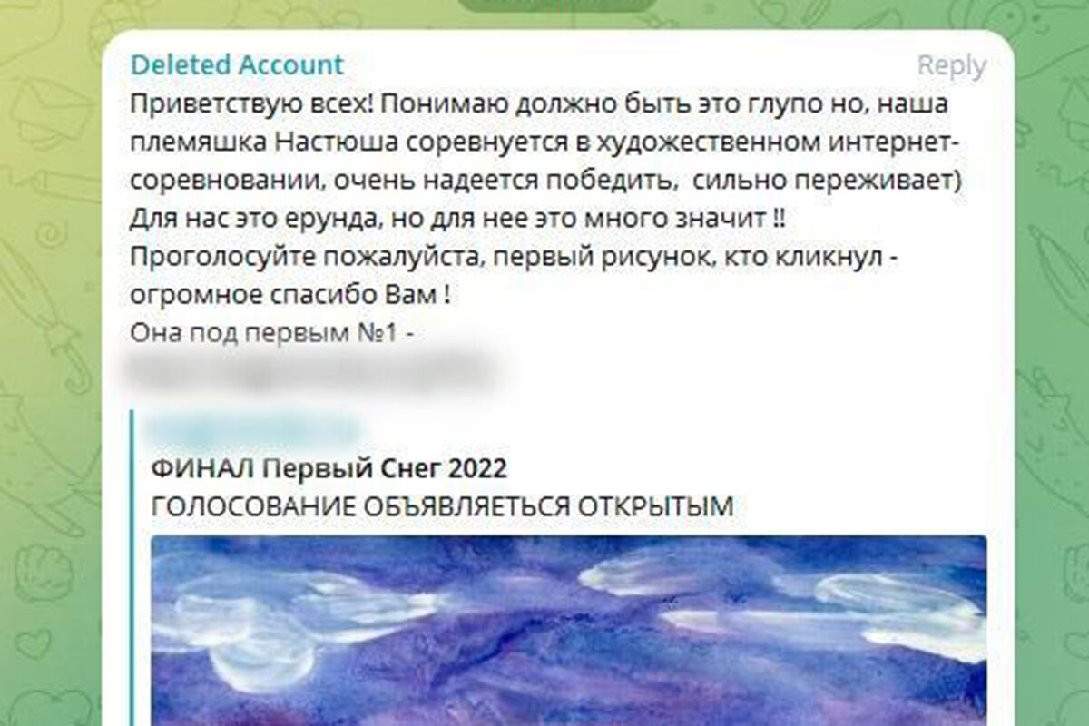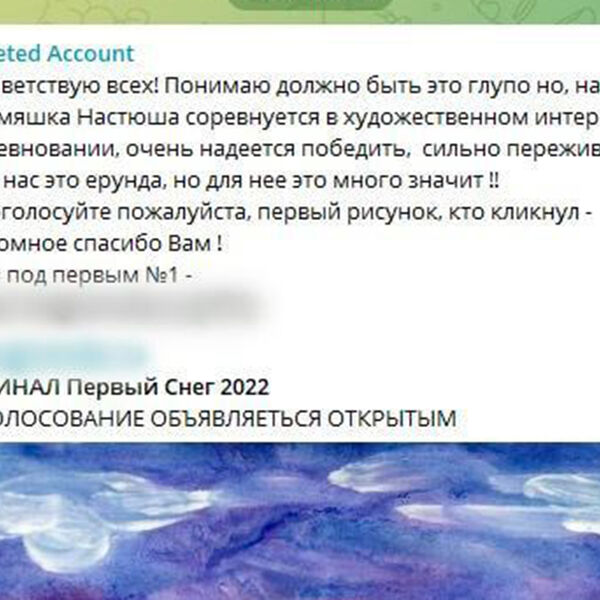 Мошенники используют уже взломанные аккаунты в Telegram и рассылают контактам, закрепленным за ними, ссылки на сайты с детскими конкурсами. Жертвам предлагается перейти по ссылке, авторизоваться там и в онлайн-голосовании поддержать своего ребенка или ребенка родственников, друзей или знакомых.
