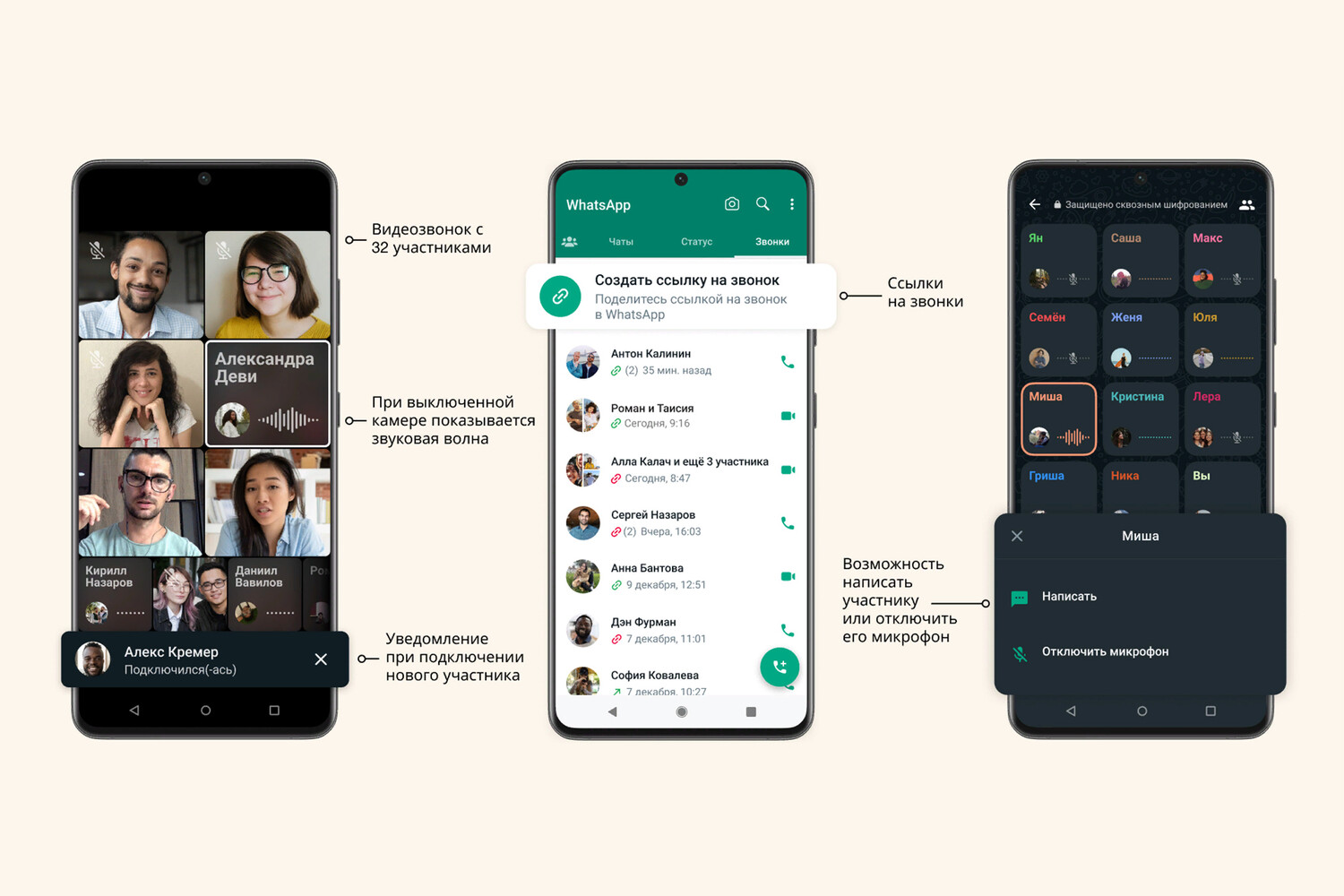 Одно из ключевых нововведений заключается в том, что теперь пользователи смогут совершать групповые аудио- и видеозвонки с 32 участниками. Также пользователи смогут написать участнику или выключить его звук, нажав по его карточке во время группового вызова. Эти функции уже доступны для пользователей WhatsApp на Android и iOS.