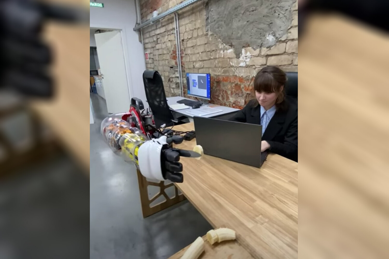 Проект выполнен на базе манипулятора Promobot Rooky. Для создания нового помощника на кухне подросток запрограммировала робо-руку, к которой прикрепила кухонный нож. На опубликованном ролике робо-рука нарезает банан ровными кусочками.