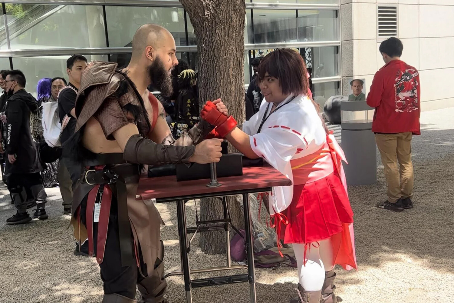 Судя по фотографиям, которые опубликовал Wee-Taku, инцидент произошел в рамках одного из интерактивов. Косплеер в образе Кратоса установил на территории мероприятия стойку для армрестлинга и предлагал всем желающим померяться силами.