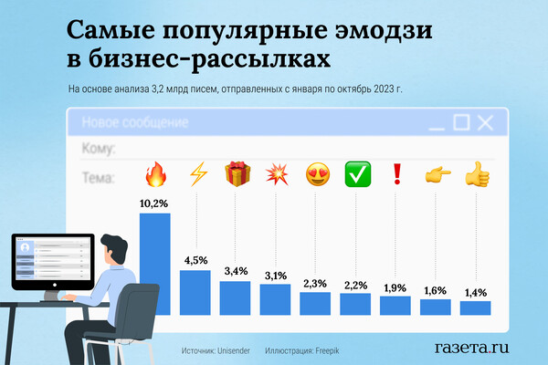 Эмодзи в виде языка пламени чаще остальных встречается в электронных письмах, отправляемых российскими компаниями. Об этом «Газете.Ru» сообщили в пресс-службе сервиса email-рассылок Unisender, после изучения более 3 млрд писем. На долю сообщений с упомянутым эмодзи пришлось 10,2%.