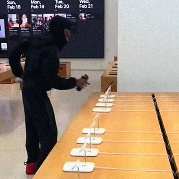 Один из посетителей снял инцидент на видео. На опубликованных кадрах видно, как мужчина грубо отрывает смартфоны от шнуров безопасности и хаотично кладет их в карманы штанов. В какой-то момент в карманах не остается места, но наглый мужчина не желает оставлять в магазине ни одного iPhone. Поэтому он продолжает зачищать стенды и складывать смартфоны уже в штаны. Все это время в магазине звучит сигнализация. Посетители Apple Store и сотрудники не решаются помешать грабителю и лишь с опаской наблюдают за ним.