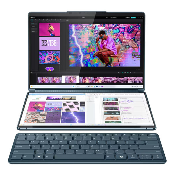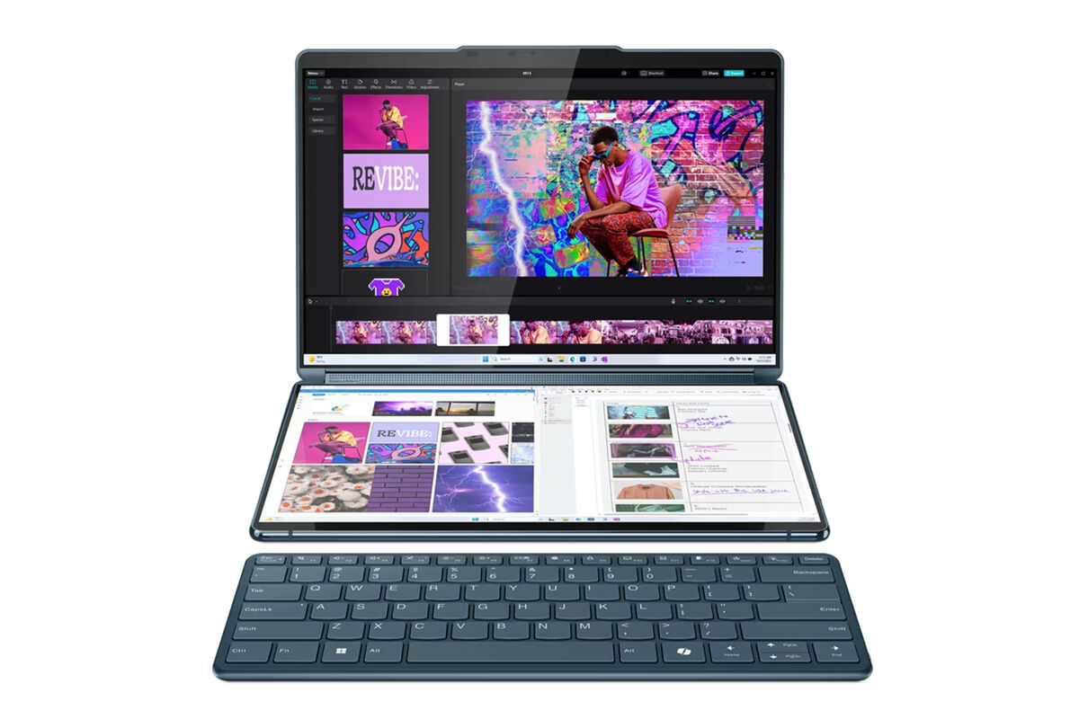 Оба OLED-дисплея имеют разрешение 2,8К (2880х1800 пикселей), яркость 400 нит и покрывают цветовой охват DCI-P3 на 100%. Устройство поддерживает работу со стилусом Lenovo Digital Pen 3 и Bluetooth-клавиатурой Yoga Book 9 KB, а также способно менять положение экранов в зависимости от задачи. Например, второй дисплей может выступать в качестве тачпада и подставки под клавиатуру.