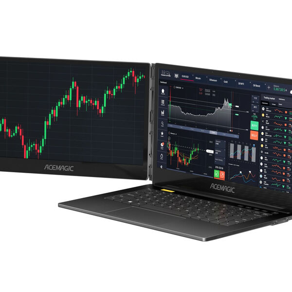 Acemagic X1 оснащается двумя 14-дюймовыми экранами с разрешением Full HD (1920х1080 пикселей), один из которых крепится на шарнире и может использоваться как рядом с основным дисплеем, так и разворачиваться на внешнюю сторону ноутбука.