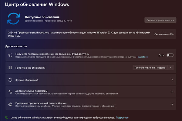 Обновление KB5041587 уже доступно в «Центре обновления Windows» в разделе «Дополнительные параметры» — «Необязательные обновления».