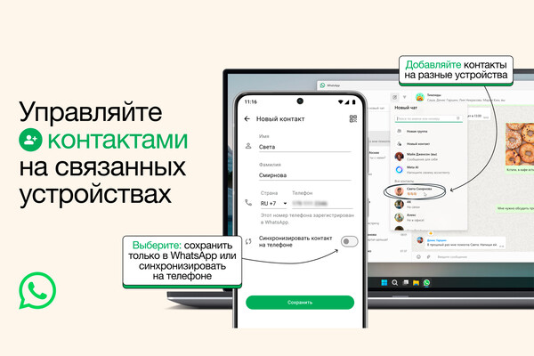 Пользователям больше не нужно сохранять контакты в телефоне — теперь достаточно добавить их непосредственно в WhatsApp. Это особенно удобно, если устройством пользуется кто-то еще или если пользователь хочет вести личные и деловые переписки в разных аккаунтах приложения.