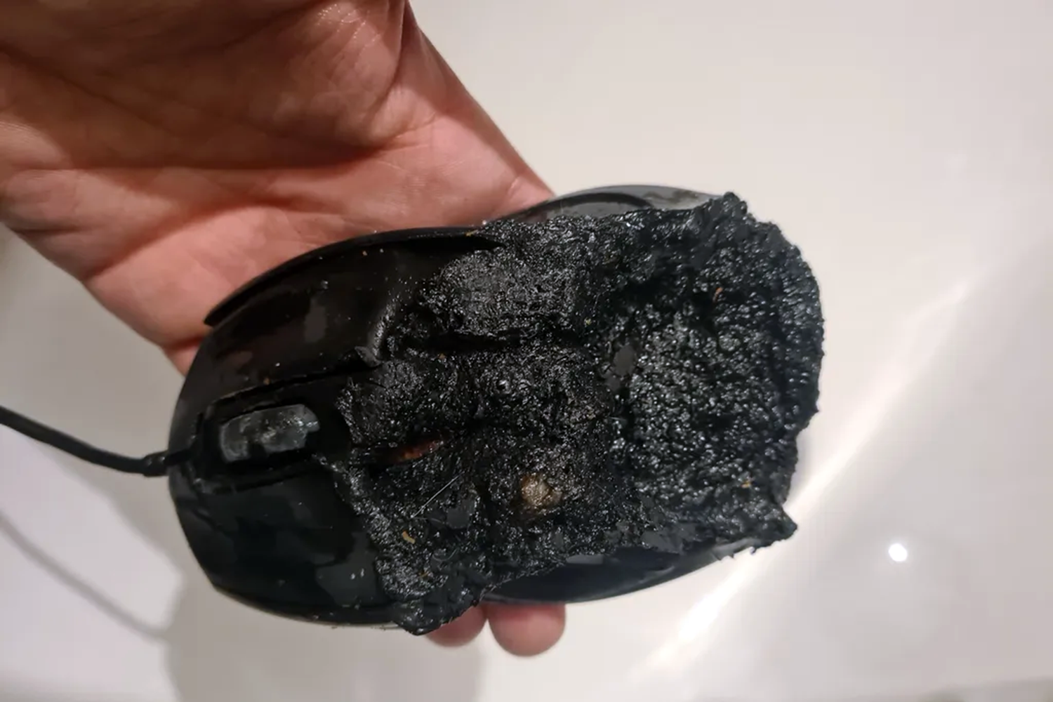 На изображениях видно, что передняя часть мыши практически не пострадала, тогда как остальная часть сильно обгорела. Почему огонь сосредоточился в одной части устройства, остается загадкой и требует дополнительного расследования.
