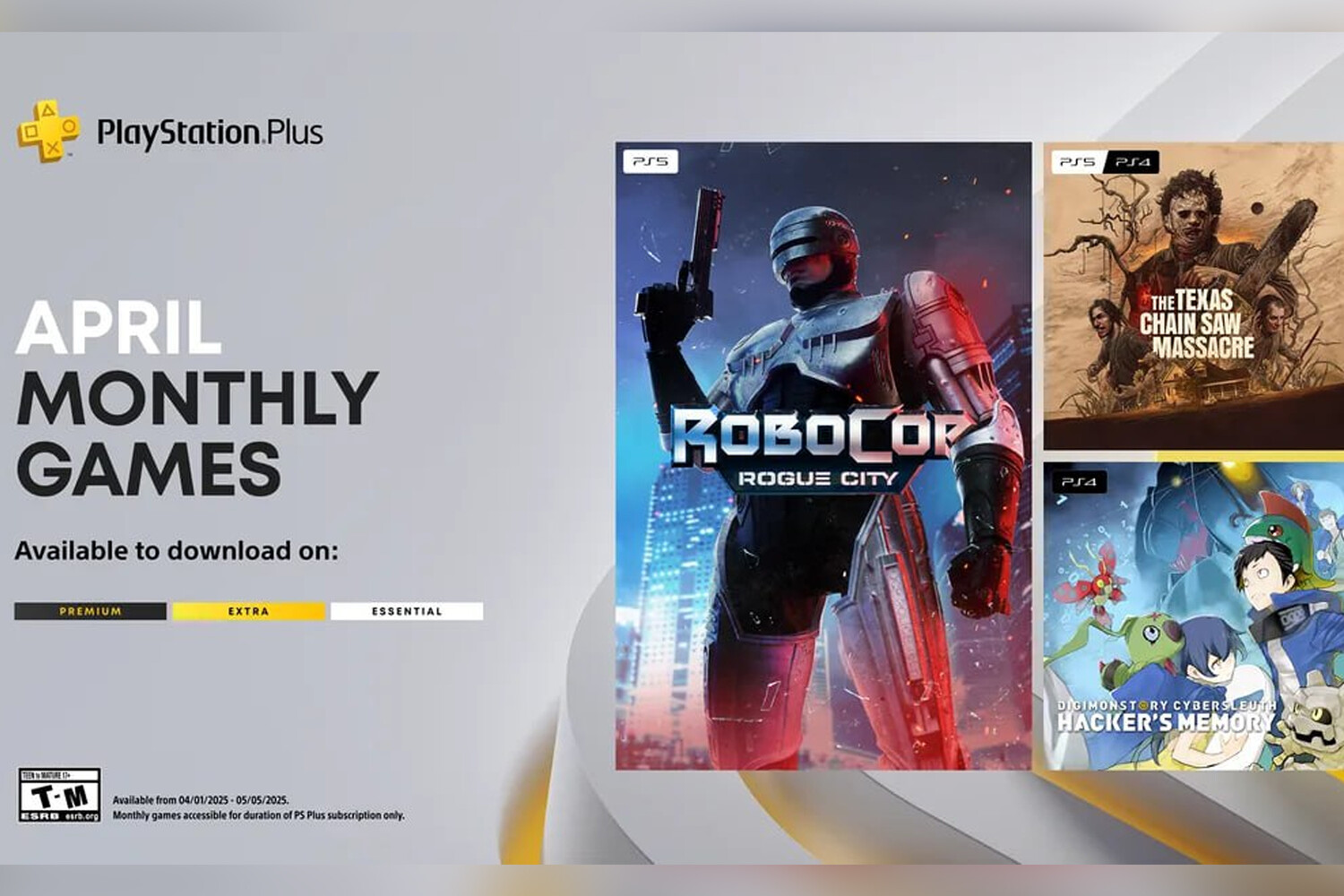 Пользователи всех тарифов подписки PS Plus с 1 апреля до 5 мая смогут добавить в свою библиотеку три игры: RoboCop: Rogue City (PS5), Digimon Story: Cyber Sleuth — Hacker's Memory (PS4, PS5) и The Texas Chain Saw Massacre (PS4, PS5). Забрав игру в рамках раздачи, пользователи смогут играть ее в любое время, пока у них есть активная подписка.