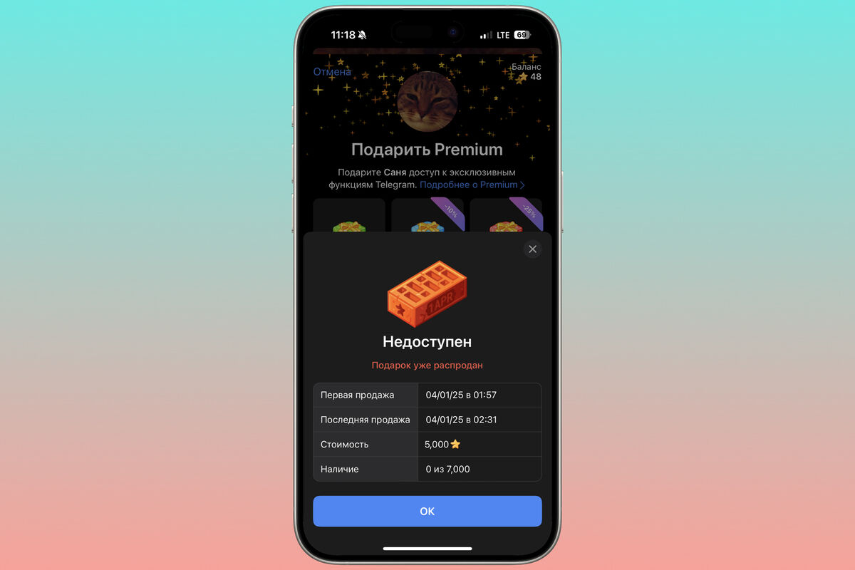 Это не самый дорогой подарок в Telegram. В мессенджере были доступны подарки, стоимость которых составляла 10000 звезд. Например, виртуальный кулон в виде сердца на 14 февраля за такую цену был распродан всего за 6 минут. Этот подарок был выпущен ограниченным тиражом в количестве 2 тыс. штук.