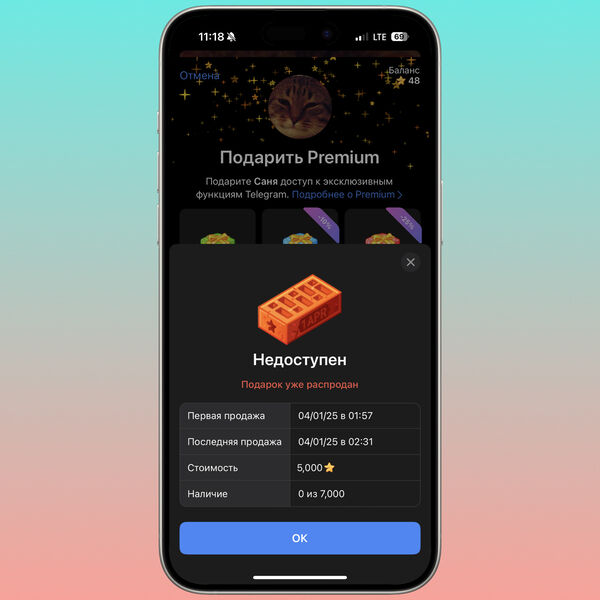 В Telegram решили оригинально отметить 1 апреля, добавив в каталог виртуальных подарков необычный объект с изображением кирпича, на котором имеется подпись «1APR». Цена подарка не смутила пользователей. За кирпич просят 5000 звезд. Такой объем виртуальной валюты на iPhone можно купить за 13690 руб. На Android 5000 звезд обойдутся в 8299 руб.