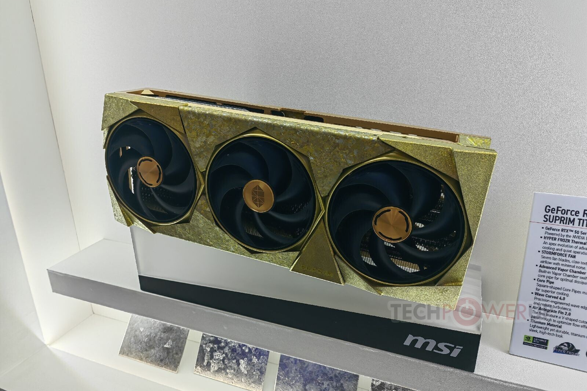 Одним из ключевых представленных продуктов стали видеокарты GeForce RTX 5090 и RTX 5080 Suprim Titanium Edition SOC, отличающиеся использованием титана в конструкции. Кожух системы охлаждения получил характерную текстуру металла, а также золотистый оттенок, происхождение которого пока не уточняется — возможно, это результат применения специального сплава или уникального технологического метода обработки.