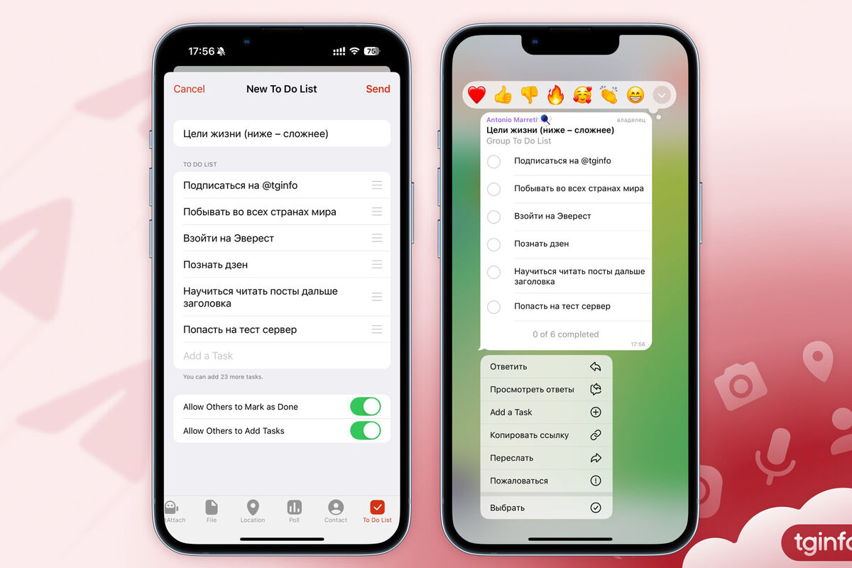 Список задач можно составлять в личных чатах и групповых переписках. Каждый список может включать до 30 пунктов. При размещении в группе автор списка может разрешить другим участникам добавлять новые задачи, а также отмечать пункты как выполненные. В таком случае рядом с выполненной задачей будет отображаться аватар выполнившего ее пользователя.