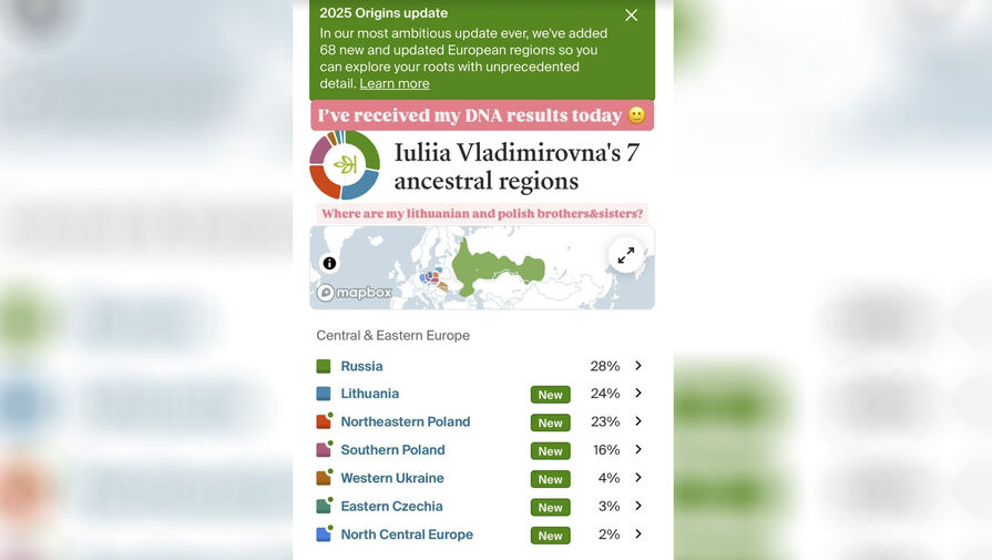 Хотя сама девушка обратила внимание только на народы с наивысшей степенью родства, на скриншоте можно увидеть и другие страны, где предположительно жили ее предки. В частности, можно увидеть, что Вавилова на 4% украинка, а также – на 3% чешка.
