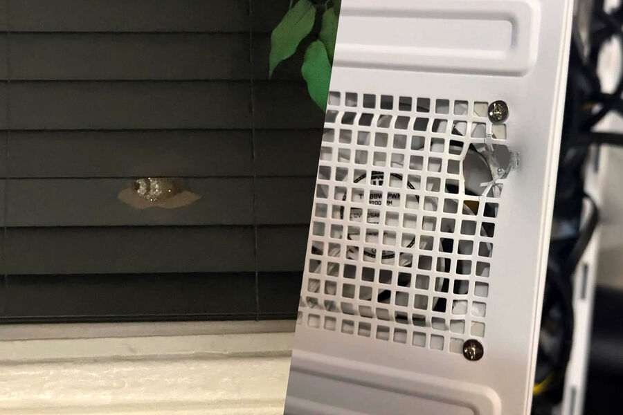 Несмотря на повреждения корпуса, компьютер остался работоспособным: пострадал только вентилятор, тогда как ключевые компоненты — оперативная память, материнская плата, видеокарта и процессор — не были задеты.
