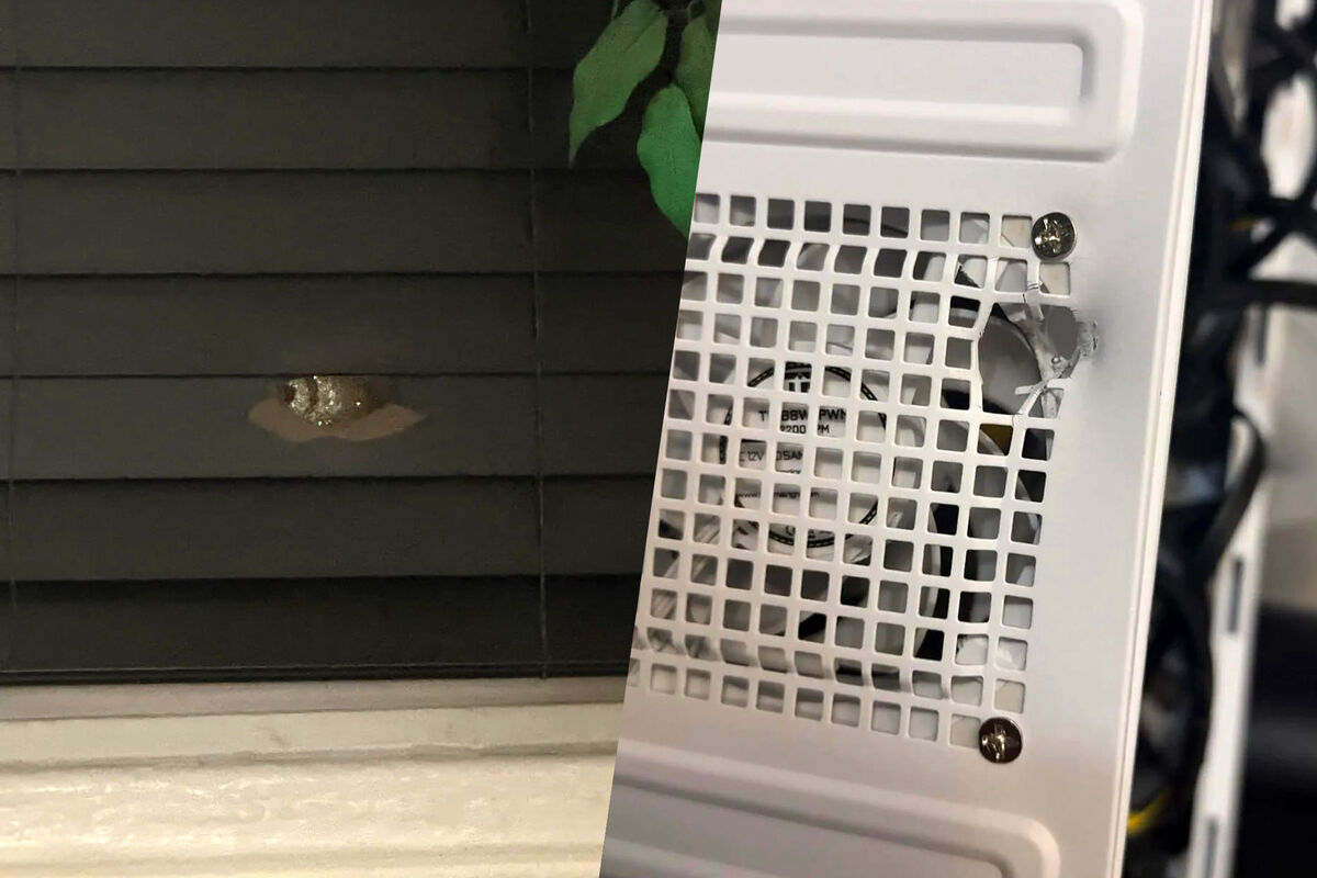 Несмотря на повреждения корпуса, компьютер остался работоспособным: пострадал только вентилятор, тогда как ключевые компоненты — оперативная память, материнская плата, видеокарта и процессор — не были задеты.
