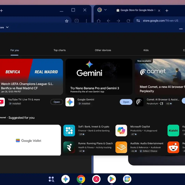 Интерфейс Google Chrome в целом соответствует версии для больших экранов Android, однако в нем появился доступ к кнопке расширений, ранее характерной только для настольного браузера. Также продемонстрированы режим разделенного экрана и оконный режим, который во многом повторяет текущее поведение Android-приложений, но с элементами, схожими с ChromeOS, включая расположение кнопок управления окнами.