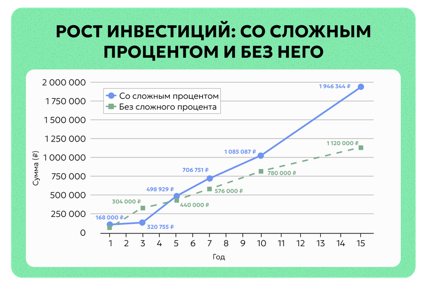 Начать можно с небольших инвестиций. 100 000 рублей — уже достаточно для старта. Сложный процент работает и с малыми суммами, если вы умеете ждать.