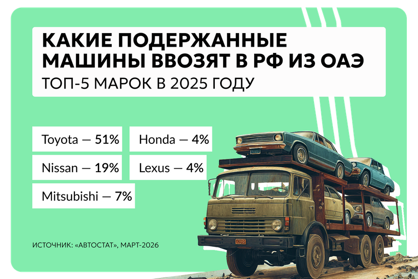 Импорт легковых авто из ОАЭ в Россию по итогам 2025 года вырос в 3 раза — до 10,5 тыс. единиц, по данным агентства «Автостат».