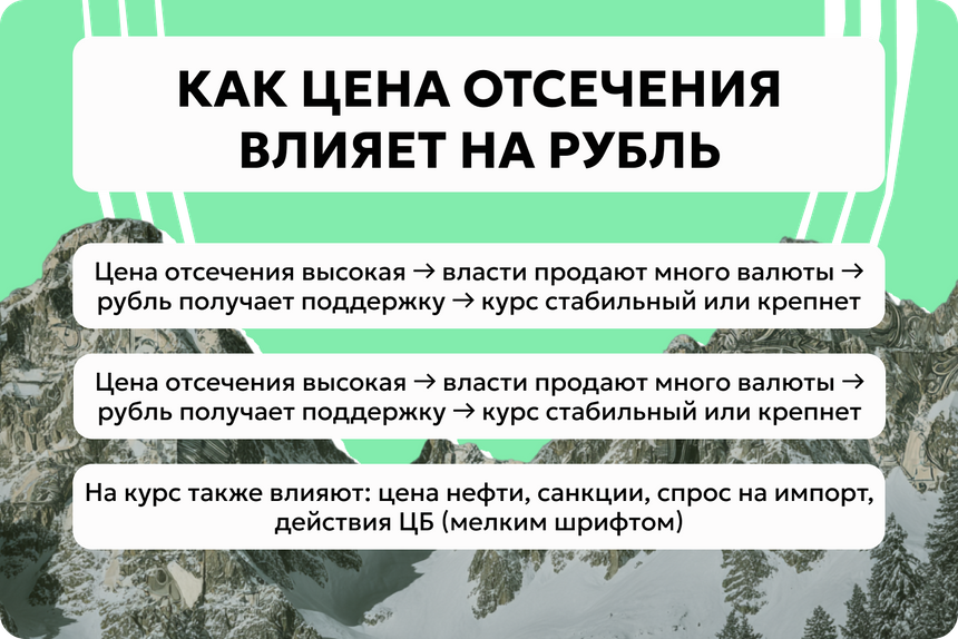 Когда цена отсечения снизится, государство станет продавать меньше иностранной валюты. Так рубль лишится поддержки, объяснил Александр. По его оценкам, это автоматически добавит к курсу доллара около 2−4 рублей сверх обычной динамики.