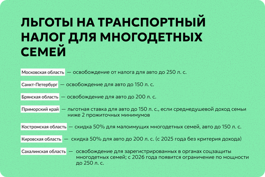 Транспортный налог — региональный, поэтому единой федеральной льготы для многодетных семей не существует. Однако многие регионы по своей инициативе освобождают семьи с детьми от уплаты налога за один автомобиль, либо дают скидку.
